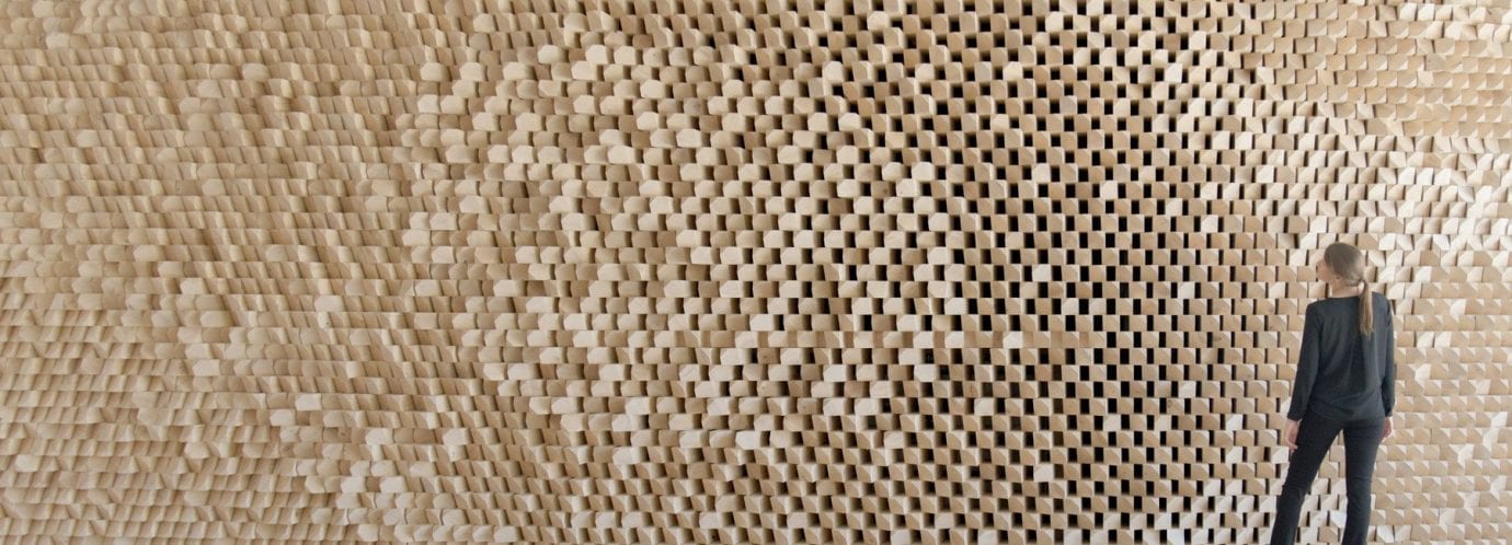 Акустические стены состоят из 8500 деревянных блоков. Сами блоки абсолютно идентичны, но расположение каждого из них – уникально. Их поверхности сориентированы по принципу диффузора Шрёдера, то есть структуры с множеством ячеек, глубина которых тщательно выверена.