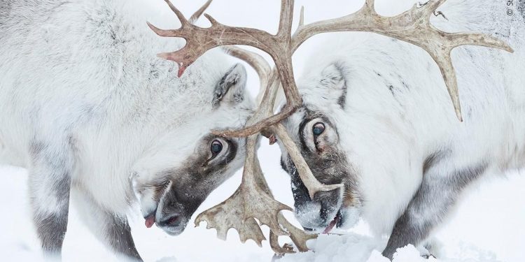 Стефано Унтерзінер з Італії став свідком того, як два північних оленя змагаються за увагу самиць. Це фото (в заголовку) здобуло перемогу в категорії Behavior: Mammals.