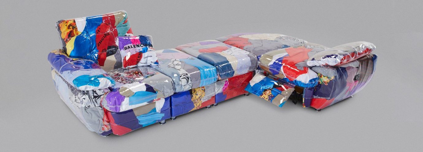Компания Balenciaga и дизайнер Гарри Нуриев создали прозрачную софу для Недели дизайна в Майами. Набивкой для нее послужила нераспроданная одежда – поврежденная или просто из устаревших коллекций. И вся эта яркая мешанина из одежды прошлых лет обернута в прозрачный винил.