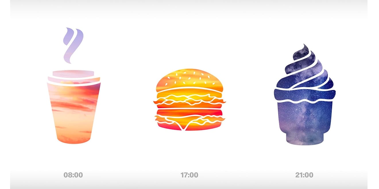 Агенція TBWA/Heimat створила дуже лаконічну серію, вмістивши максимум змісту у мінімум форми. Вона пов’язала різноманітні продукти McDonald’s з годинами дня.