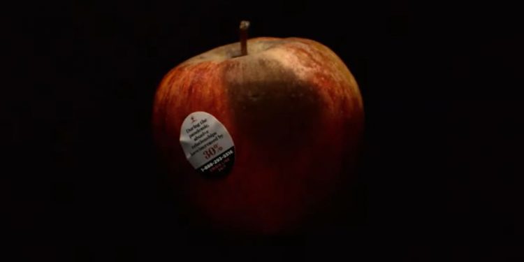 На перший погляд стенди кампанії Bruised Fruit – це звичайні полиці з яблуками, що втратили товарний вигляд. Але якщо придивитися до наліпок на них, там можна прочитати невтішну статистику щодо того, наприклад, як нездорові стосунки під час локдауну дедалі частіше деградують до фізичного насильства. Кожна з таких наліпок містить телефонний номер цілодобової лінії довіри Interval House.