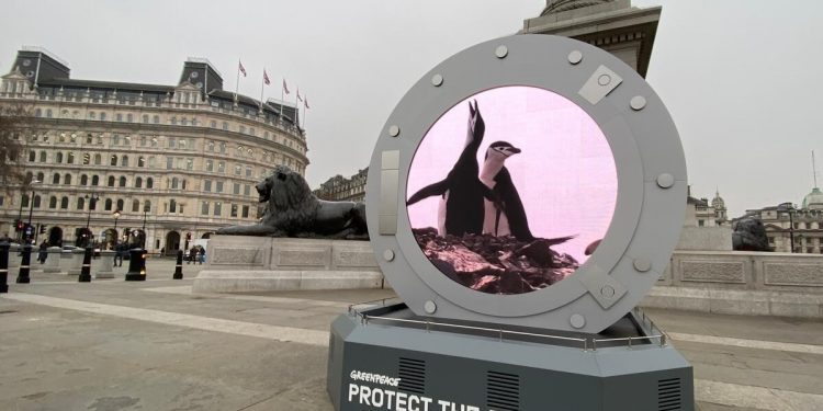 Впродовж цього тижня в центрі Лондона на Трафальгарській площі можна було побачити дивовижне видовище — своєрідний «портал» в Антарктику, крізь який дослідники Greenpeace вели трансляцію з антарктичного узбережжя в реальному часі.