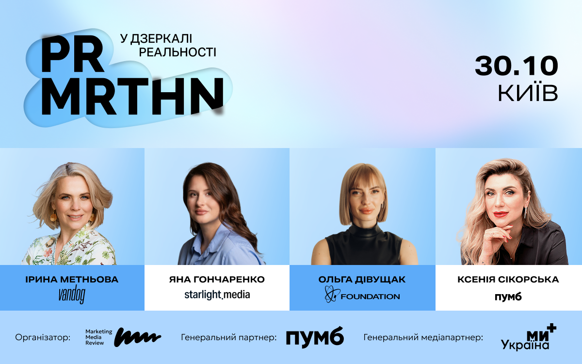 30 жовтня 2025 року понад 300 комунікаційників і маркетологів та 30 спікерів з усієї України візьмуть участь у PR-марафоні «У дзеркалі реальності». У програмі: 4 панельні дискусії, кейси від ПУМБ, «Ковальська», Eva, Bolt, корпорації «Біосфера» та інших топових компаній, церемонія нагородження Конкурсу PR-кейсів. Учасники обговорять інструменти побудови довіри, прозорості та ефективної комунікації, а також досвід адаптації брендів до швидких змін суспільних настроїв.