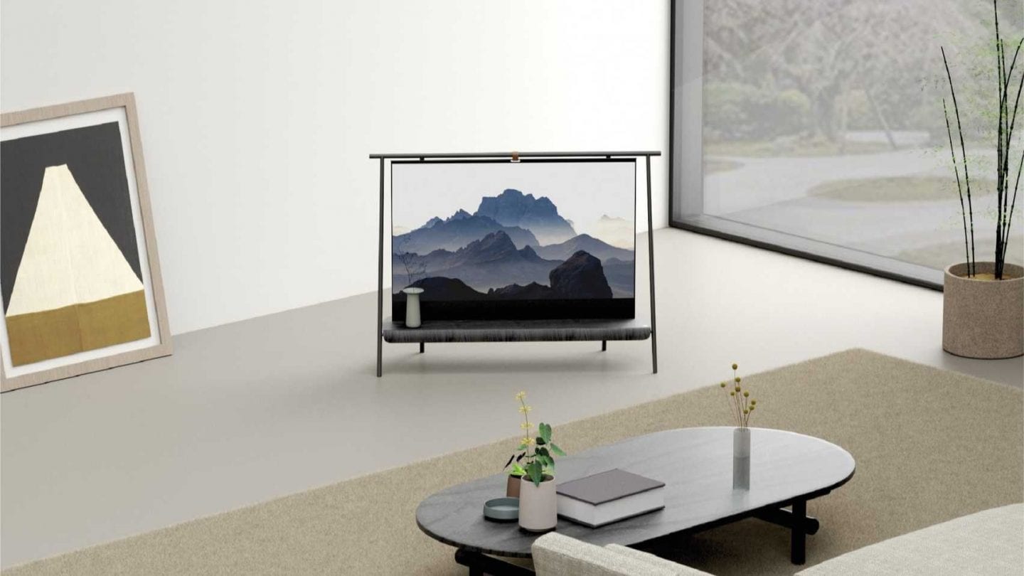OLED є набагато легшими, якщо порівнювати їх зі старішими технологіями. То навіщо ж їх продовжувати кріпити на стіни чи ставити на тумби? Цей екран висить у повітрі, «як риба на гачку», і його можна легко покрутити чи нахилити.
