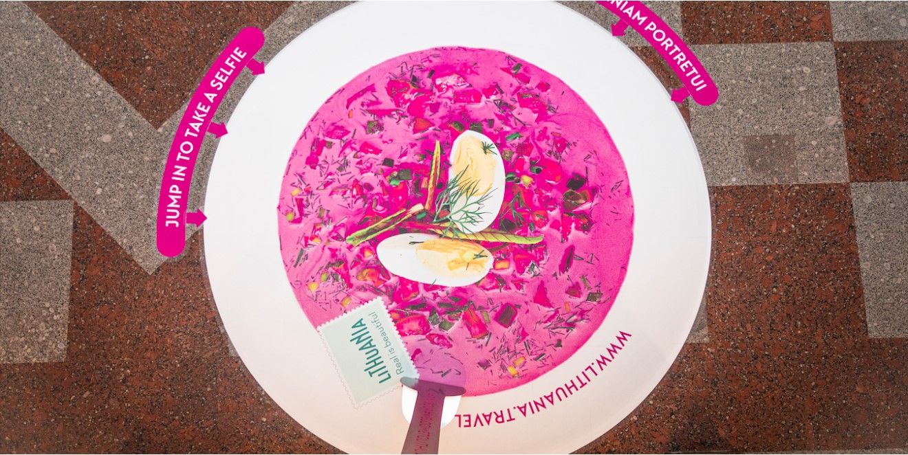 В рамках своєї нової кампанії організація Lithuania Travel влаштувала невеличкий редизайн у Міжнародному аеропорту Вільнюса. З 29 червня усі пасажири мають можливість пройти по доріжці з рожевих кіл, яка виводить їх до місця, що нагадує велетенську триметрову тарілку з рожевим борщем. Креативна команда сподівається, що така інсталяція стане непоганим тлом для селфі й посяде своє заслужене місце у Instagram.