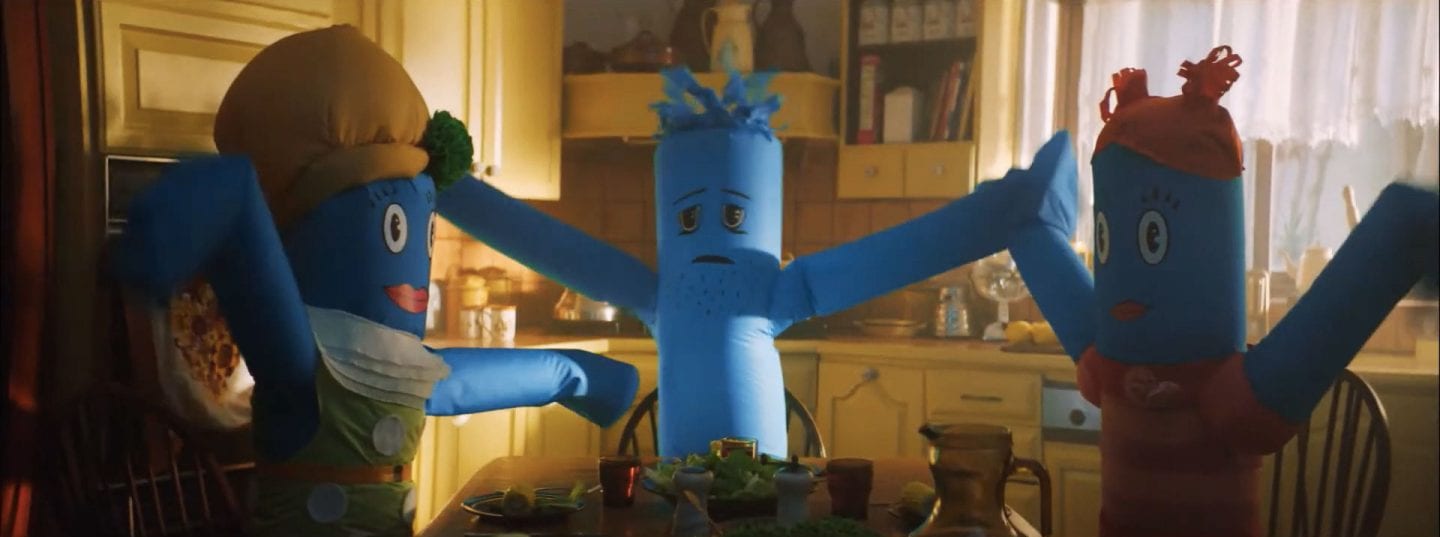 За цим слідує кожне кліше, яке ми звикли бачити у фільмах про невдах. Навіть бійка у барі, що закінчилася арештом синього чоловічка. Після цього на нього чекає гурток психотерапії для непотрібних маскотів. (Тільки погляньте на того бідолаху у костюмі хот-дога!) А ночами він лежить увесь здутий та втупляє у стелю, чим ще більше засмучує свою пані Синій Чоловічок.